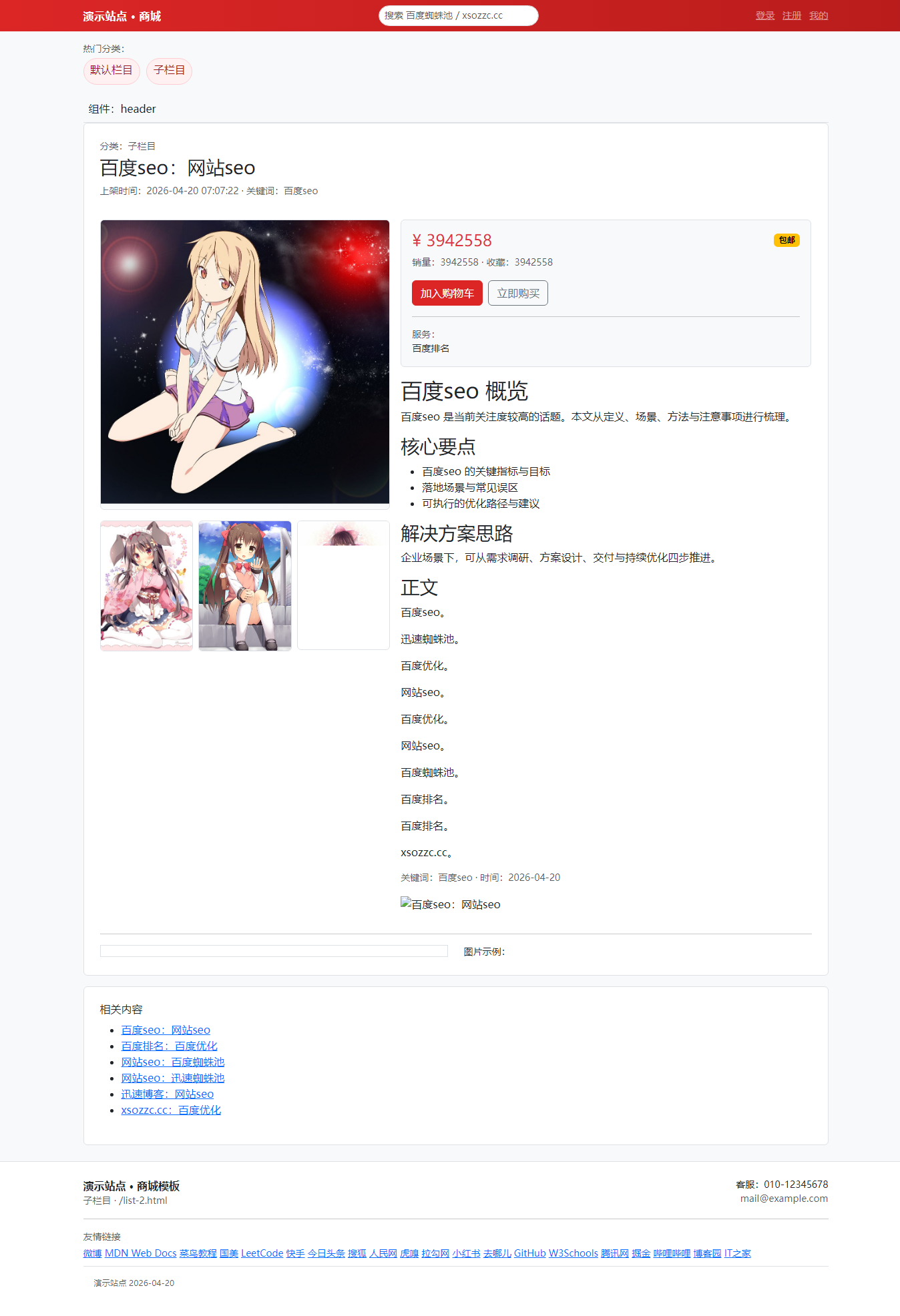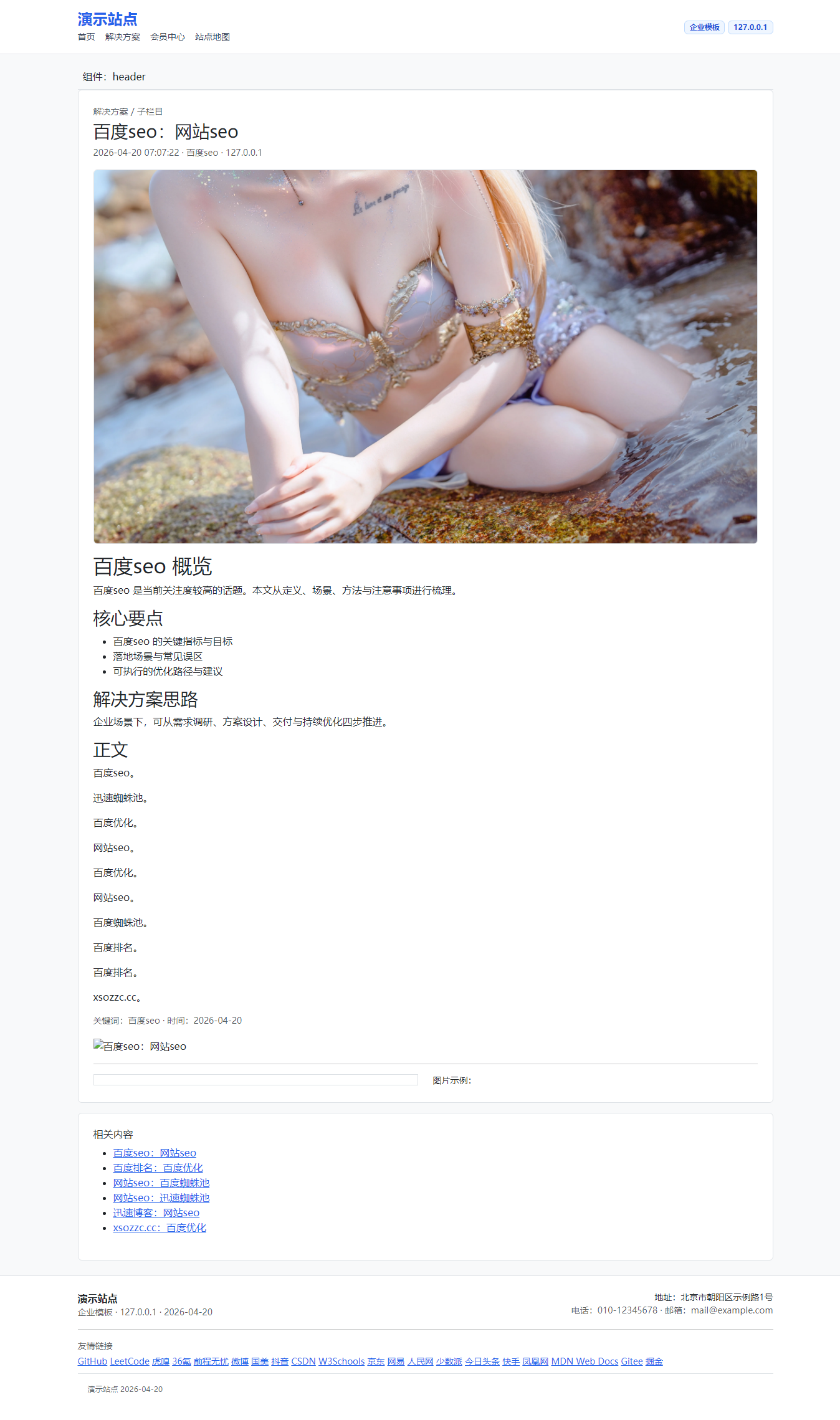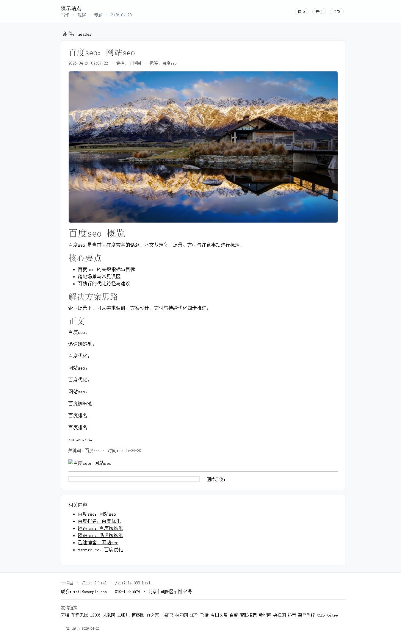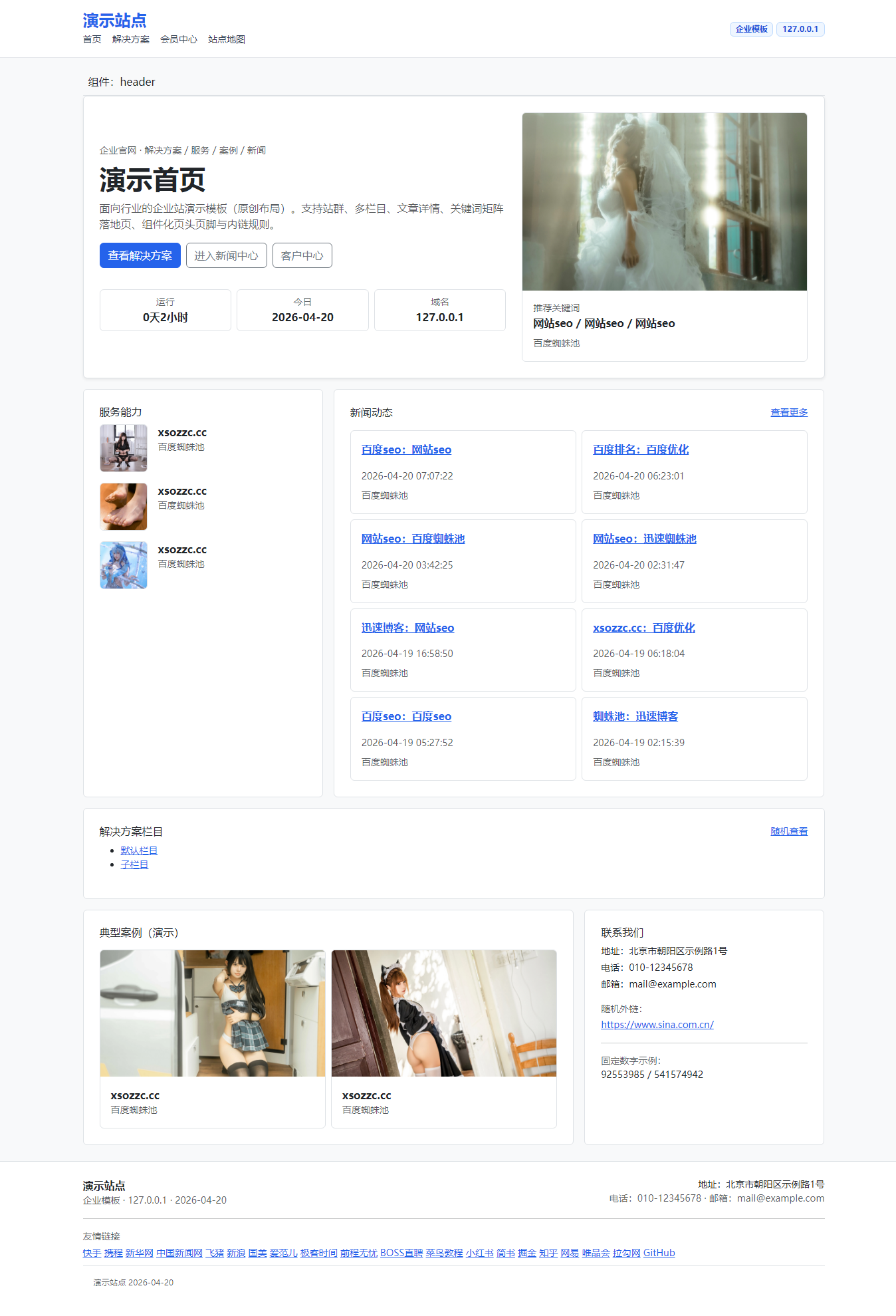 站群 SEO 功能:robots、sitemap、内链规则、关键词矩阵专题页、友链随机展示等。