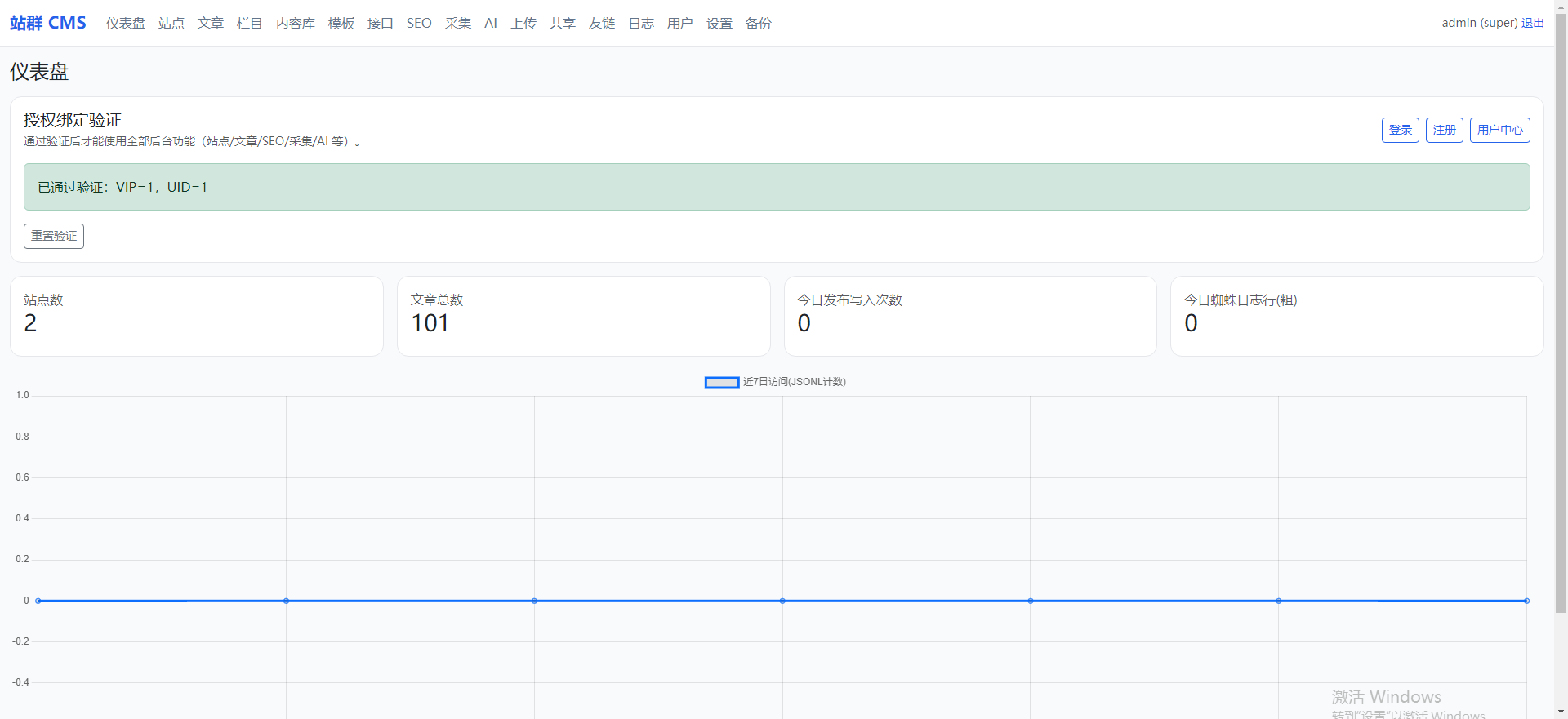 展示 站点数量、文章总量、发布写入统计、蜘蛛日志统计 等概览信息。