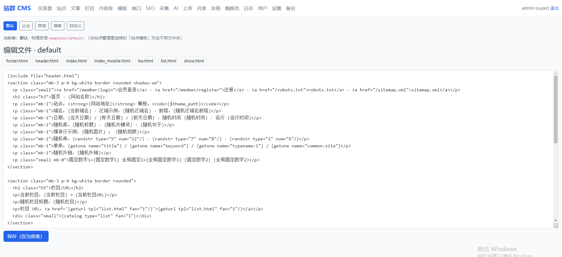 多模板体系:默认/企业/商城/博客/自定义 五套模板可切换,模板可在后台编辑。