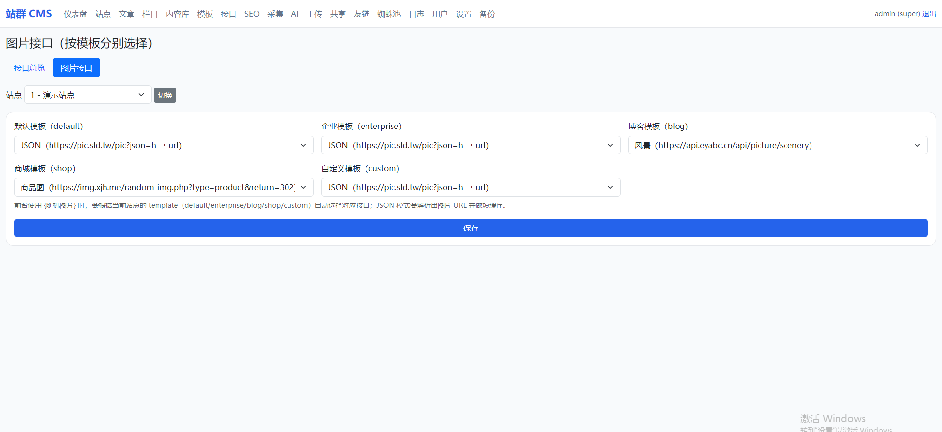 提供“图片接口”配置入口,可按模板选择不同图片源。