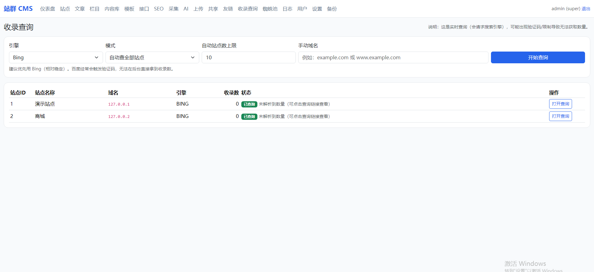 后台“收录查询”页面支持对站点域名执行 真实搜索引擎