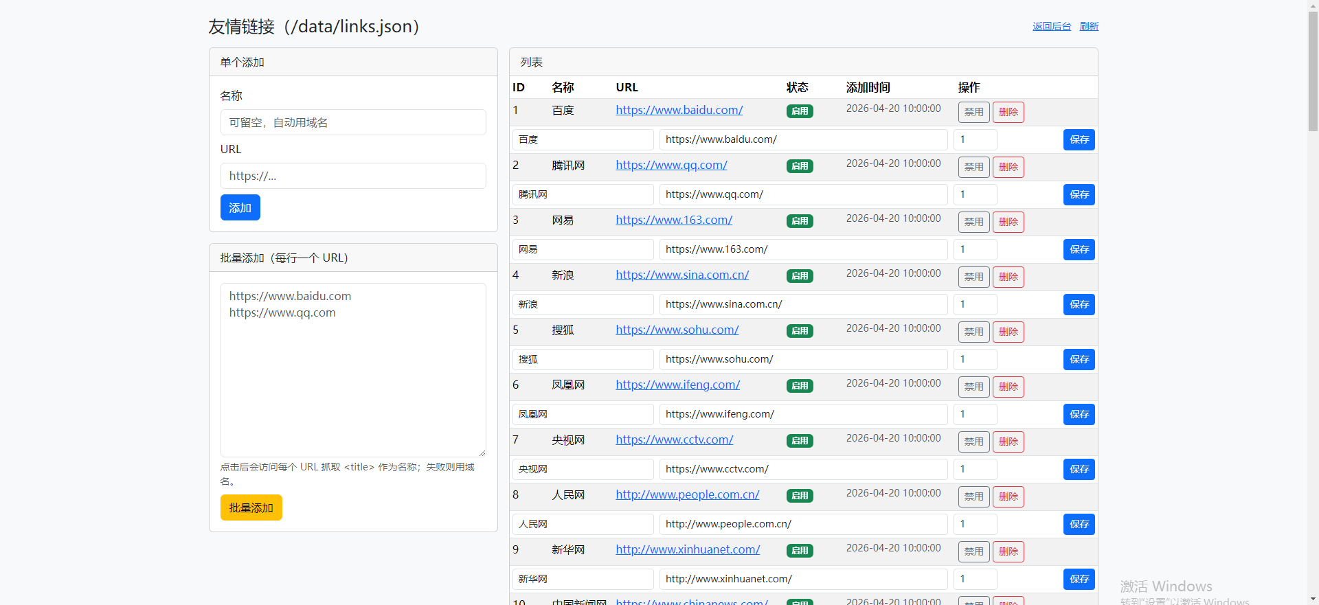 data/links.json),支持启用/禁用、编辑、删除、批量添加。前台模板标签